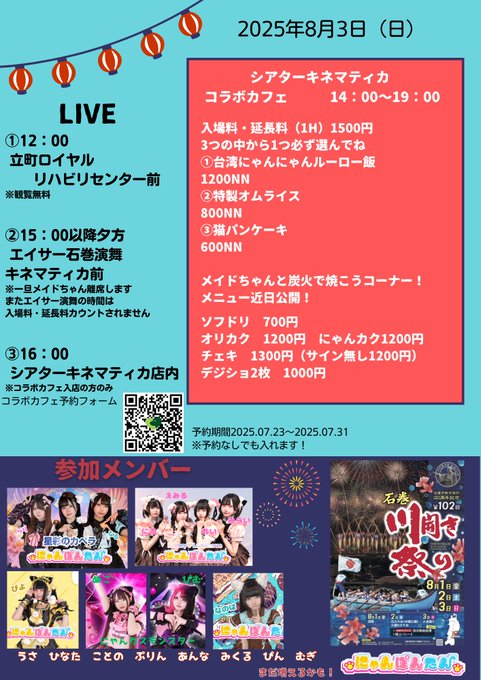 固定仙台にゃんこメイドカフェ♡にゃんぽんたん@tw_nyanpontan·🐬今年も!石巻川開き祭り🐬 2025/08/03 Sun LIVE 立町ロイヤルリハビリセンター前 コラボカフェ 14:00~19:00 15:00以降夕方エイサー石巻演舞 シアターキネマティカ店内ライブ 16:00 参加メンバー 星彩のカペラ りこ @riko_nyanpontan なる @neko_narusan らり @rirtia__さらに表示18337,333