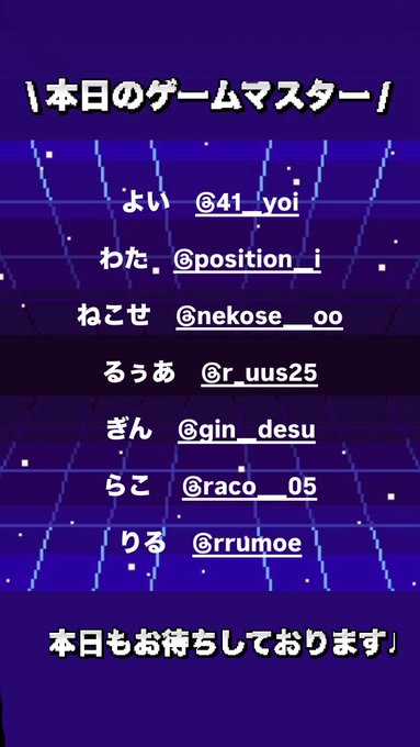 萌すてーしょん@moesute_concafe·🛜本日のゲームマスター🛜 よい ▶︎ @41__yoi わた ▶︎ @llo699_ ねこせ ▶︎ @mogumogu______n るぅあ ▶︎ @s205_96 ぎん ▶︎@gin__desu らこ ▶︎ @raco__05 りる ▶︎ @rrumoe 本日もお待ちしてます♩2264