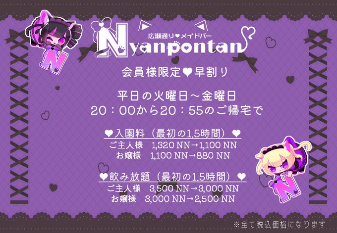 仙台にゃんこメイドバー💜Nyanpontan@bar_nyanpontan·本日のメイドちゃん ゆぺ とおる はくろ もぴ ぴの みくる もあ りこ みなみ なちゃ 21時~ らり 22時~ なの 22時半~ たぬ 23時~ りあ 💜木曜日は26時までにゃ💜61,101