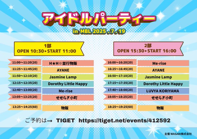 IDOL STAGE LUVYA郡山@LIdolstage·✨おすすめ✨ 明日は対バンライブ👍 本日、23:59まで前売り予約受付中❣ 7/19(土) MBL アイドルパーティー in MBL 2025 7 19 ②Start 16:00 ■料金 前売2,500円(D別) 🎫https://tiget.net/events/412592 ※凛、れい、いろはの出演になります。 ※2部のみの出演です。 ※ラブヤのステージは撮影禁止361,645