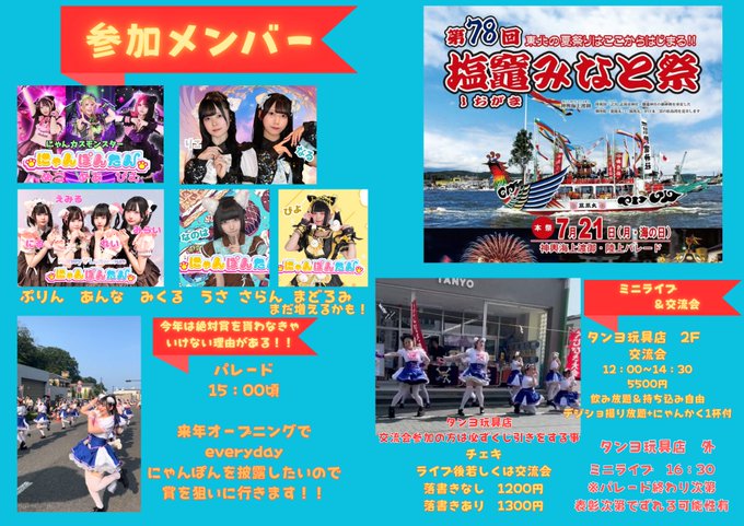 仙台にゃんこメイドバー💜Nyanpontanさんがリポスト仙台にゃんこメイドカフェ♡にゃんぽんたん@tw_nyanpontan·🚢セトリ公開にゃ🚢 7/21(月祝) ミニライブセトリ公開にゃ! タンヨ玩具店前 16:30 @Tanyo_Shiogama ※表彰される場合時間がズレる可能性有 最優秀賞狙ってるにゃん🐱 交流会は持ち込みOK 出店のものを沢山持込んで貰えるとメイドちゃんが喜んで最優秀賞に近づきます🐱 にゃんカスモンスター めあさらに表示19192.3万