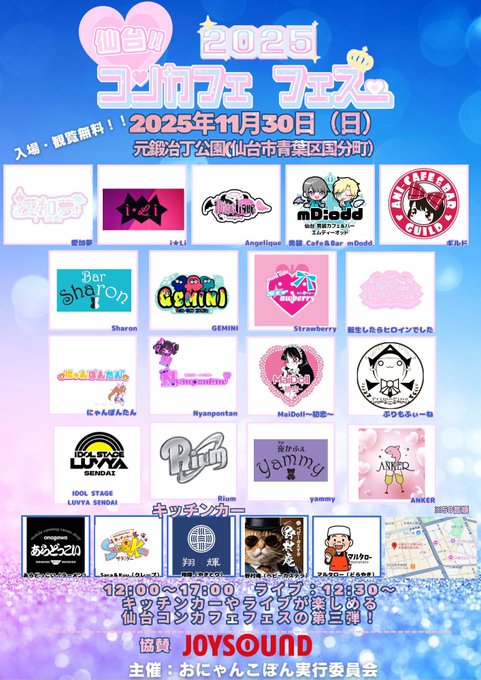 メイドカフェストロベリー【公式】@Strawberry0210f·5時間💘明日開催💘  たくさんのご観覧をお待ちしております🙇引用メイドカフェストロベリー【公式】@Strawberry0210f·11月28日#仙台コンカフェフェス 2025 -開催日時:11月30日12:00~17:00 -会場:元鍛冶丁公園野外ステージ(国分町2-9-13) -ストロベリー出演時間:15:20〜15:35 -料金:観覧無料 -物販:チェキ会※ブース:ステージ側最前 -ストロベリー出演メイド:うらら @ULALAND_ めう @meuberry_ あぴゅ @apyuberry5373