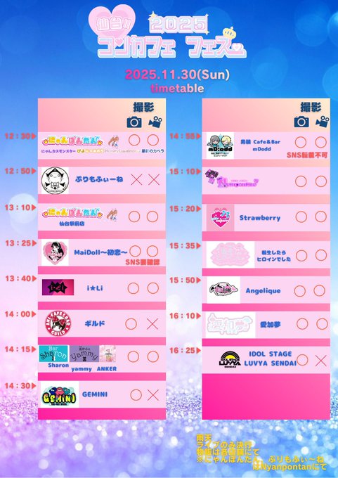 メイドカフェストロベリー【公式】@Strawberry0210f·7時間💘本日開催💘引用仙台にゃんこメイドカフェ♡にゃんぽんたん@tw_nyanpontan·11月17日📢✨ 仙台コンカフェフェス2025 ✨📢 タイムテーブル大公開💖 📅 2025年11月30日(日) 📍 元鍛冶町公園 🕛 12:00~ #仙台コンカフェフェス #コンカフェ #仙台イベント4243
