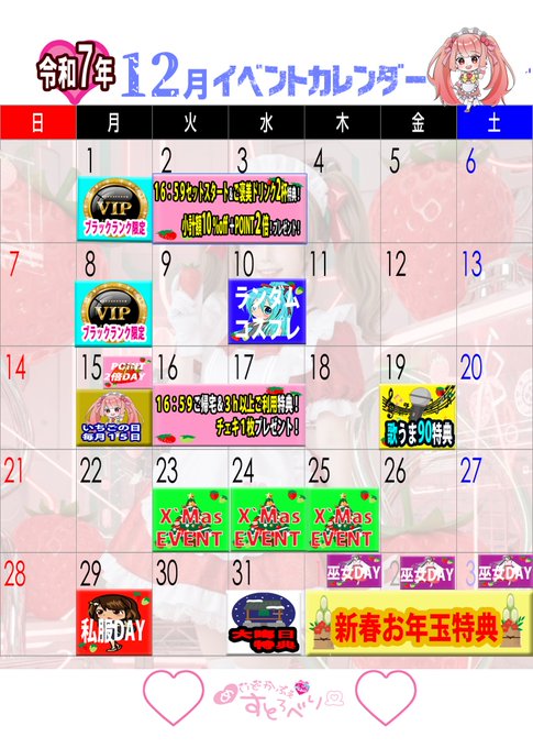 固定メイドカフェストロベリー【公式】@Strawberry0210f·💘12月イベントカレンダー💘 イベント日程、および内容等は、急遽、変更、延期、中止となる可能性もございます。 あらかじめ、ご了承下さい🙇36420