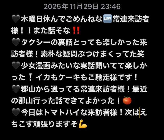 秋葉原・神田 Bunny's Guild バニーズギルドれん@BG@ren_BG·おっちゅ チェキや乾杯ありがと🍆‼️ いろんな麺をいただいた助かる🙂↕️🫰🏻 チキンのトマト煮うますぎた😫 今二日酔いきてて具合悪い🥸 ので汁飲んで寝ます🥹🥹🥹🥹🥹 また明日〜🍻2123298