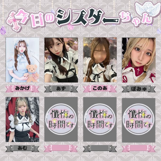 秋葉原・神田 懺悔の時間です懺悔の時間です☦️秋葉原コンカフェ☦️@zange_akb·☦️今日のシスターちゃん☦️ 11月24日 Mon 18:00 OPEN✨ みかげ@369_mkg あず@zange_azu このあ@zange_konoa ぽみゅ@pomyu_zange あむ@zange_amu2110