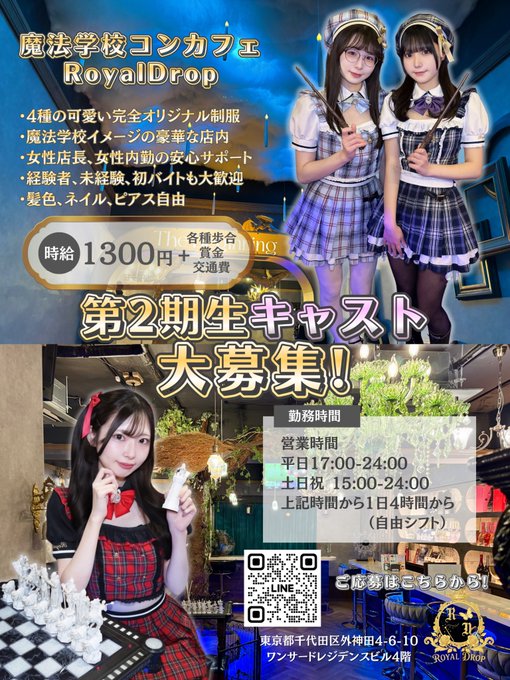 秋葉原・神田 【新規オープン】RoyalDrop 秋葉原コンカフェ💛魔法学校RoyalDrop💛秋葉原コンカフェ@RoyalDrop_maid·秋葉原に魔法学校が本格開校🪄✨ ロイヤルドロップでは第2期生キャストを大募集中💫 豪華な内装×可愛い制服🎀 女性内勤在籍で安心👩💼 経験者はもちろん、未経験・初バイトも大歓迎💖 応募はこちらのリンクから🔗https://lin.ee/ljudfzM #秋葉原 #コンカフェ #コンカフェ求人166