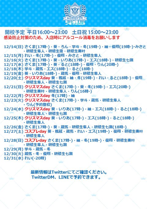 秋葉原・神田 私立輝羅星学院プリンス部固定私立輝羅星学院プリンス部@kiraboshiprince·【開校予定】登校予定を更新しました イケメンの男装部員がカフェでお待ちしています 入り口にアルコールジェルを設置してありますので、ご利用ください DM、LINEでカフェの予約が出来ます1105