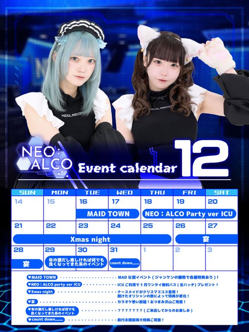 秋葉原・神田 NEO:ALCOHOLICNEO:ALCOHOLIC🧬秋葉原コンカフェ@NEO_ALCOHOLIC·⋆꙳•̩̩͙❅*̩̩͙‧͙ ‧͙*̩̩͙❆ ͙͛ ˚₊⋆⋆꙳•̩̩͙❅*̩̩͙‧͙ ‧͙*̩̩͙❆ ͙͛ ˚₊⋆ NEO:ALCOHOLIC 12月カレンダー ⋆꙳•̩̩͙❅*̩̩͙‧͙ ‧͙*̩̩͙❆ ͙͛ ˚₊⋆⋆꙳•̩̩͙❅*̩̩͙‧͙ ‧͙*̩̩͙❆ ͙͛ ˚₊⋆ 今月もイベントが盛りだくさん! 来店してみないと、わからない最大特典も・・・?4