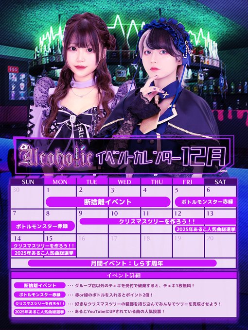 秋葉原・神田 NEO:ALCOHOLICNEO:ALCOHOLIC🧬秋葉原コンカフェ@NEO_ALCOHOLIC·⋆꙳•̩̩͙❅*̩̩͙‧͙ ‧͙*̩̩͙❆ ͙͛ ˚₊⋆⋆꙳•̩̩͙❅*̩̩͙‧͙ ‧͙*̩̩͙❆ ͙͛ ˚₊⋆ NEO:ALCOHOLIC 12月カレンダー ⋆꙳•̩̩͙❅*̩̩͙‧͙ ‧͙*̩̩͙❆ ͙͛ ˚₊⋆⋆꙳•̩̩͙❅*̩̩͙‧͙ ‧͙*̩̩͙❆ ͙͛ ˚₊⋆ 今月もイベントが盛りだくさん! 来店してみないと、わからない最大特典も・・・?4