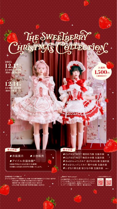 秋葉原・神田 アキバリウムみりんさん👶🏻🩷🩷🩷さんがリポストMIN costume@MIN_idolcos·🎀 MIN costume展示会開催決定! 🎀 『 The Sweetberry Christmas Collection 』 今年の冬はショートケーキをテーマに展示会を開催します🍓 CUTIE STREET、きゅるりんってしてみて、いぎなり東北産など、これまで手がけたお衣装を一挙に展示✨さらに表示14462,35527万