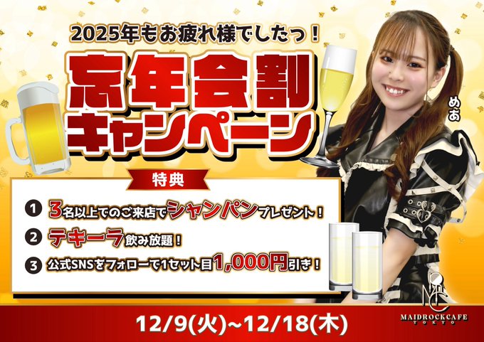 秋葉原・神田 メイドロックカフェ東京しおん@sion_mrc·8時間めっちゃぐだぐだですww お待ちしております‼️引用MRC TOKYO@mrcafe_akiba·8時間メイドロックカフェ東京オープンしてます🎸 わちゃわちゃしおんちゃん@sion_mrc とすあ@sua_mrc ちゃんがお届け🎁 12/12(金)も16:00-25:00 忘年会🈹キャンペーン開催中❣️お待ちしております🌟 #秋葉原 #コンカフェ #メイドロックカフェ東京0:2215204