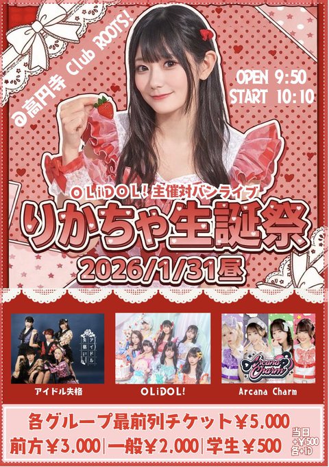 秋葉原・神田 秋葉原トリプルセブン有ゆうな😋❤️【ArcanaCharm】さんがリポストArcanaCharm@ArcanaCharm·♡ #あるあむライブスケジュール ♡ \最新フライヤー公開/ ⚠️出演時間・特典会時間に変更がございます 1/31(土) 『OLiDOL!主催〜りかちゃ生誕祭〜』 📍 高円寺Club ROOTS ⏰ OPEN 9:50/START 10:10 🎤 11:55〜12:15 📸 13:25〜14:40(終演後) 🎫 最前チケット ¥5,000 前方チケット ¥3,000さらに表示313655