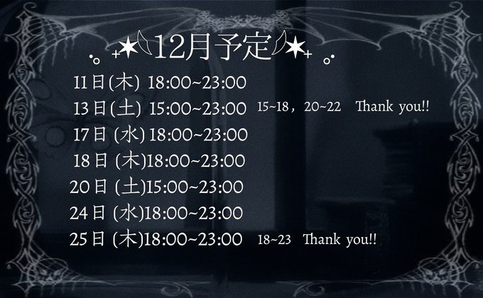 ももね@momone_BM·12月後半いる日 19日(金)22時〜5時 20日(土)22時〜5時 21日(日)22時〜5時 25日(木)22時〜5時 27日(土)22時〜5時 28日(日)22時〜5時 30日(火)22時〜5時 31日(水)22時〜5時 です!クリスマスも年越しも一緒にいれるってワケ😽初めましてさんも二度目ましてさんも全人類待ってます🏃4109