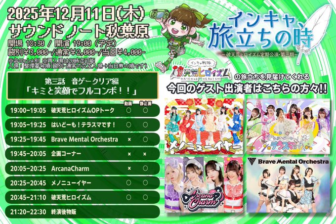 有ゆうな😋❤️【ArcanaCharm】さんがリポストArcanaCharm@ArcanaCharm·♡ #あるあむライブスケジュール ♡ 本日のあるあむは… 12/11(木) 『破天荒ヒロイズム定期公演・第三期 「インキャ、旅立ちの時」第三話 音ゲークリア編〜キミと笑顔でフルコンボ!〜』 📍 サウンドノート秋葉原 ⏰ OPEN 18:30/START 19:00 🎤20:05〜20:25 💬21:20〜22:30(終演後)さらに表示7172,260