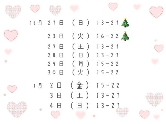 秋葉原・神田 Cherie bell固定ゆう【Chérie bell 】@cherie_yuu_·12月後半〜年明けまでのお給仕予定♡ サンタゆうが待ってるよ〜🎅🏻🎀 年末年始はたくさんいる予定です❕ 早めに予約してもらえるとはっぴー!😽 ちなみに次は13日(土)だよん!9109