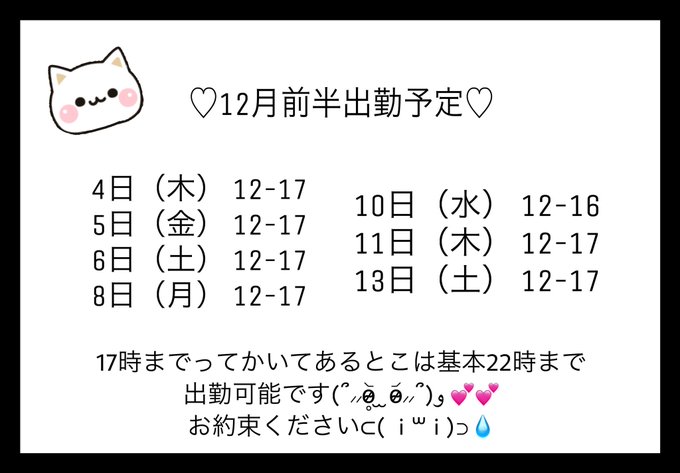 秋葉原・神田 LOOP秋葉原メイド&ダーツバーなの꒰ঌ ♡ ໒꒱@loop_nano·4時間10日と11日ひよこ氏と交代しました!9日はキャプテン代理で13日はラストまでいます!!引用LOOP 秋葉原 💫メイド🛸ダーツバー💫@loop_akihabara·12月2日12月前半シフト 🎯なのちゃん JAPANレディース 渡邉芹奈プロ 2日(火)17:00〜24:00 5日(金)19:45〜23:45 6日(土)20:00〜24:00 7日(日) 18:00〜22:00 9日(火)17:00〜24:00 10日(水)19:30〜23:30 12日(金)19:45〜23:45 13日(土)20:00〜21:00110277