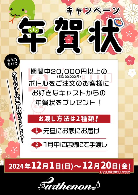 秋葉原・神田 ビジュラム 東京店薫🍺ビジュラム東京@kuyuru_beer·6時間俺からの年賀状、送らせて!引用ぱるてのんグループ@公式@parthenonpro_·2024年11月29日【 💌ぱるてのん年賀状キャンペーン🐍 】 🗓 12/1(日)〜12/20(金) 🗓 期間中、『 20,000円 』以上の ボトルをご注文のお客様に 好きなキャストから 直筆の年賀状をプレゼント💓 🪭 元旦に届けてもらっちゃう❣ 🪭 1月中に手渡ししてもらちゃう❣4234