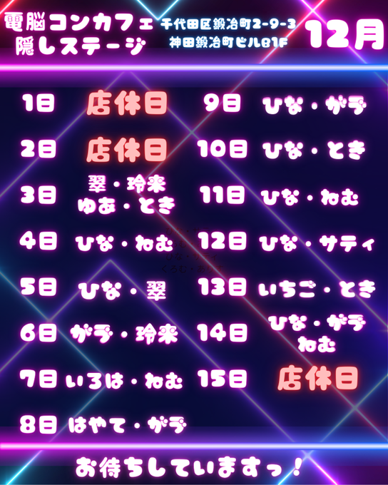 秋葉原・神田 電脳コンカフェ 隠しステージ固定🎮🎧電脳カジノコンカフェ ♠♥ 隠しステージ ♦♣神田・秋葉原エリア@kakushistage·🌸12月前半のログイン情報です🌸 #ポーカー #推しポ #初心者大歓迎 #コンカフェ54