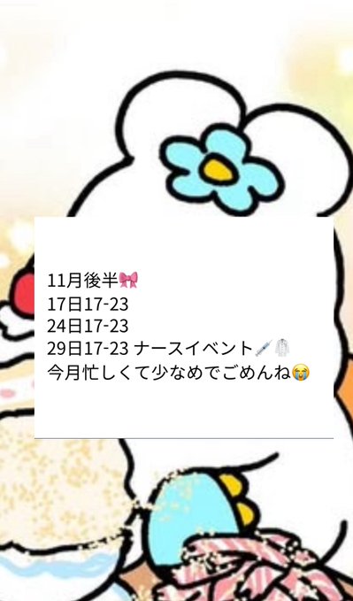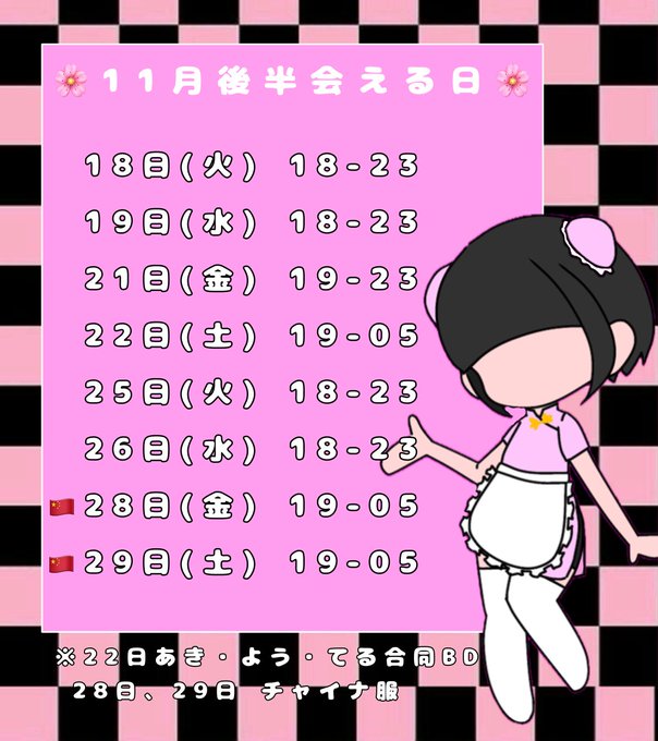 秋葉原・神田 みざりー固定はな🌸みざりー@misery_hana·🌸11月後半会える日🌸 22日はあきちゃんようちゃんてるさんのBD🎂 28日と29日はチャイナ服です🇨🇳 他の日もお得だったりするのでお約束DM待ってます この日出れない?って予定出勤も受け付けてます🫡7176