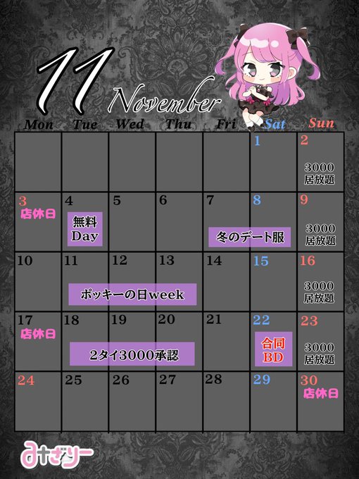 秋葉原・神田 みざりー固定あき🐈⬛🖤みざりー@misery_aki·11月後半の出勤予定です❕ᐡ ᴗ͈ ̫ ᴗ͈ ᐡ 22日はほんとに本当に待ちに待った合同生誕祭です!♡ とっても楽しみな1日……!たくさんのご来訪をお待ちしております🐱💪✨10128