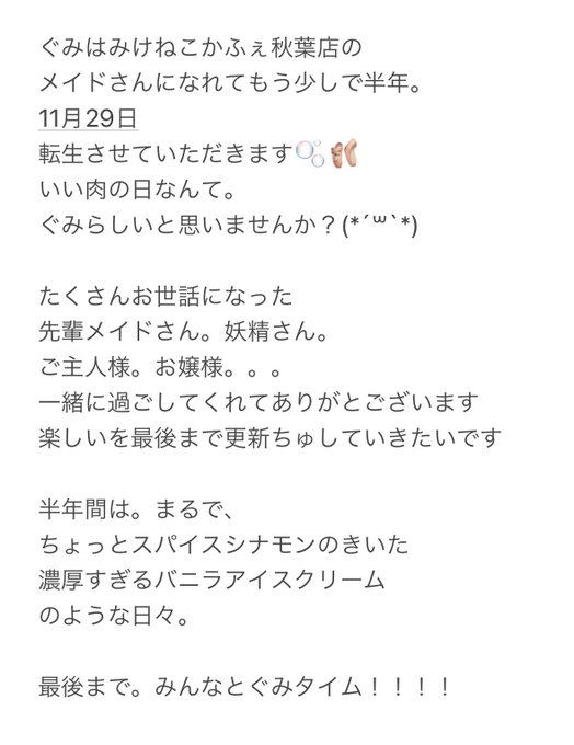 秋葉原・神田 みけねこカフェ秋葉原店夜@みけねこカフェ秋葉原さんがリポストぐみ@みけねこカフェ秋葉原@gumimikecat·。ぐみからもみんなさんにお知らせ。 たくさんこれからも 最後まで。ぐみタイム 🫧 少しでもたくさんの ご主人様、お嬢様、メイドさん みんなさんに 感謝の気持ちを伝えられたと思うので 会える時に。ぐみにお時間もらえたら とってもうれしいです34311,124