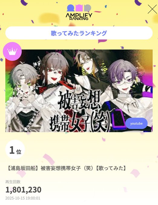 秋葉原・神田 コンカフェ あるこほりっく 秋葉原院すーぱーりちやん😈💜@alco_ritsu·2時間1位だ😭😭😭😭😭引用AmplifyRanking(アンプリファイランキング)@AmplifyRanking·6時間アンプラ歌ってみたウィークリーランキング 1位 【浦島坂田船】被害妄想携帯女子(笑)【歌ってみた】 @USSS_info https://youtube.com/watch?v=-GRqcBGQx1w… 2位 マシュマロ/まふまふ【歌ってみた】 @uni_mafumafu https://youtube.com/watch?v=bODpjB3JolQ… 3位 IRIS OUT 歌ってみたのはメガテラ・ゼロ @megater_0さらに表示2215