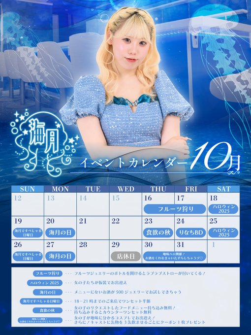 秋葉原・神田 海月 秋葉原コンカフェ海月🪼-秋葉原コンカフェ-@kurage_concafe·・。。・゚・。。・゚・。。・゚・。。・゚゚・。。・゚゚・。。・ : : 10月 ☆ : イベントカレンダー ☆ ・。。・゚・。。・゚・。。・゚・。。・゚゚・。。・゚゚・。。・ 秋と言ったら?なイベントがたくさん✨ 何の仮装をするかはお楽しみに🩵🪄 #秋葉原 #コンカフェ2329