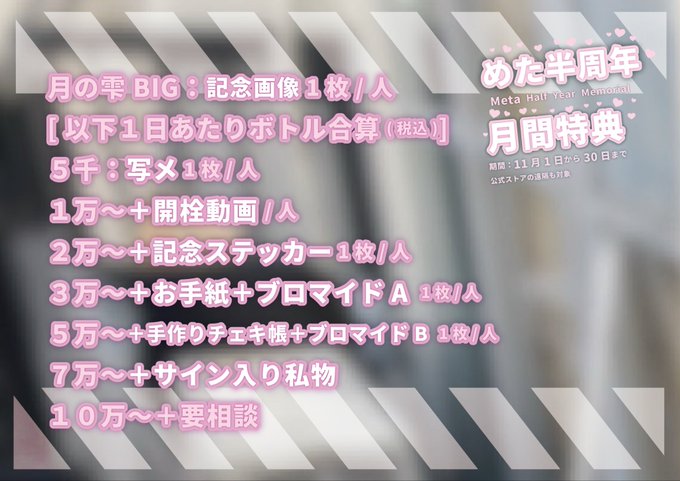 秋葉原・神田 ルナパラドックス 本館・別館・ラボなの 10/20いる❕さんがリポストルナパラドックス -LUNA PRDX-@studio_annex·11月【半周年🎉告知】 🎂めた半周年月間特典 🎂雫&ボトル合算特典🥂画像参照 🎂特典対象期間:11月1日〜30日 ▶️遠隔/ボトル予約も対象🎂 公式ストア🔜 http://minatogrill.com/shop56865