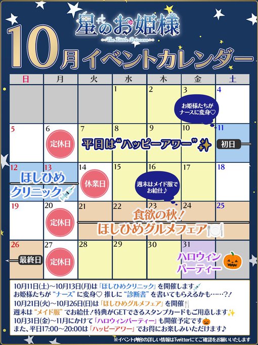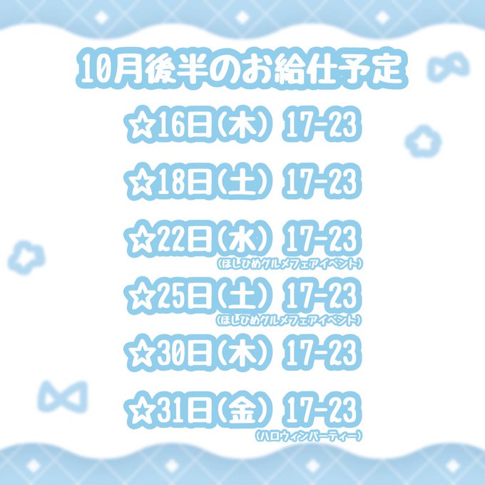 秋葉原・神田 星のお姫様 秋葉原コンカフェ固定ふゆめ@fuyum_hoshihime·10月後半のお給仕予定🌟 グルメフェアイベントいます!25日はメイドさんになります🎀 ハロウィンイベント初日いますよ〜👻なにきようかなあ?? ご予約DMにてお待ちしております𝜗𝜚꙳.*5281