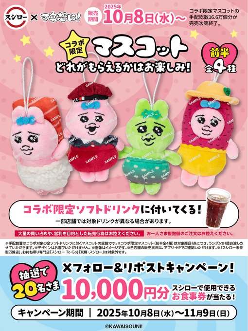 秋葉原・神田 アキバリウムつむちま໒꒱@riumu_tumugi·10月9日ぜったいにほしいのに限界コンカフェ嬢だからご飯食べるお金ない引用正方形のプロフィール画像スシロー@akindosushiroco·10月8日/ #スシロー × #可哀想に! 本日からコラボスタート!🍣✨ \ 🍣 スシロー可哀想にコラボ 抽選で20名さまに🧧お食事券🧧が当たる🎁 1⃣ @akindosushiroco をフォロー📲 2⃣この投稿をいいね❤&リポスト🔃 🤍詳しくは▶https://akindo-sushiro.co.jp/campaign/detail.php?id=4091…1120