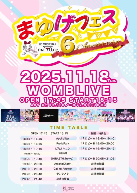 秋葉原・神田 秋葉原トリプルセブン有ゆうな😋❤️【ArcanaCharm】さんがリポストArcanaCharm@ArcanaCharm·♡#あるあむライブスケジュール♡ 〜タイムテーブル公開〜 11/18(火) 『まゆげフェス 6anniversary』 📍 WOMB LIVE ⏰ OPEN 17:45/START 18:15 🎤 19:40~20:00 💬 20:40~21:40 🎫前方¥3,500/一般 ¥2,000 ※各+1D代 http://livepocket.jp/e/nfobr 販売期間2025/11/15 21:00〜2025/11/18 18:30さらに表示310520
