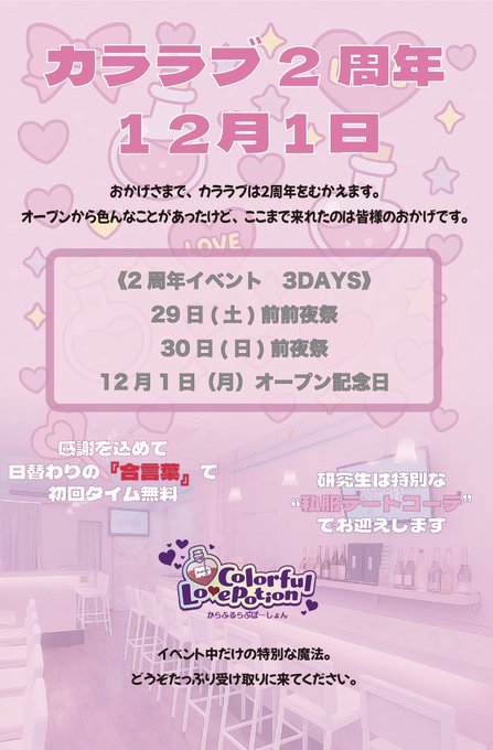 秋葉原・神田 Colorful Lovepotion𝐂𝐨𝐥𝐨𝐫𝐟𝐮𝐥 𝐋𝐨𝐯𝐞𝐩𝐨𝐭𝐢𝐨𝐧🩷秋葉原コンカフェさんがリポストのん@カララブ@CLP_non·9時間30日会える方いればお給仕します⊂( ᴖ ̫ᴖ )⊃💖私服イベント🤔 DMおまちしてます🎶♡引用𝐂𝐨𝐥𝐨𝐫𝐟𝐮𝐥 𝐋𝐨𝐯𝐞𝐩𝐨𝐭𝐢𝐨𝐧🩷秋葉原コンカフェ@CLP_CAFE·11月14日【イベント告知】 ✨ 12月1日 カララブ 2周年 ✨ おかげさまでカララブは2周年を迎えます🎉 それに伴い、2周年イベントを開催します! 3日間だけの特別な魔法、 ぜひ受け取りに来てください💞🪄 #秋葉原 #コンカフェ #カララブ19772