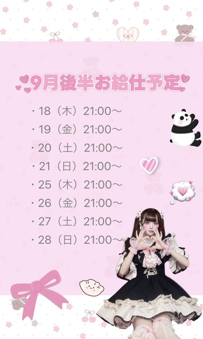秋葉原・神田 ピュアメイドめい🐼@mei__pure·₊˚ ‿︵‿︵୨୧ · · ♡ · · ୨୧‿︵‿︵˚₊ 9月後半のお給仕予定です🥟 イベントはパンダチャイナ服を着る予定🐼💞 後半もよろしくお願いします꒰ ᐡᴗ͈ ·̫ ᴗ͈ ꒱ ︎︎❤︎191,596