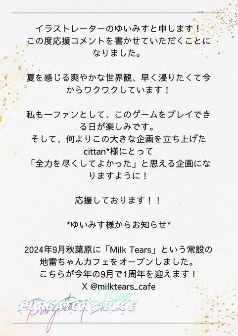 秋葉原・神田 Milk Tears -みるてぃあ-ゆいみす🎀地雷系女子イラストレーターさんがリポストパーガトリー・ブルー公式@es_studio_info·\ \ \\ // / / ⋅⋆⋄✧ ゆいみす (@yuimisu_ ) 様から クラファン応援コメントを頂戴しました!!! 本当にありがとうございます!! 地雷ちゃんカフェ1周年おめでとうございます!!💣10491万