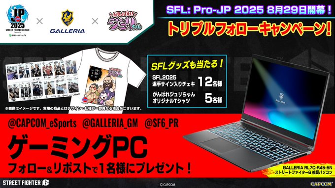秋葉原・神田 NoALilしぐれさんがリポスト正方形のプロフィール画像CAPCOM eSports@CAPCOM_eSports·※不備がございましたので再投稿いたします。 / SFL: Pro-JP 2025 8月29日開幕🔥 トリプルフォローキャンペーン🎊 \ 🎁GALLERIA RL7C-R45-5N ストリートファイター6推奨パソコン 🎁選手サイン入りチェキ 🎁オリジナルTシャツ さらに表示2651.3万5,461619万