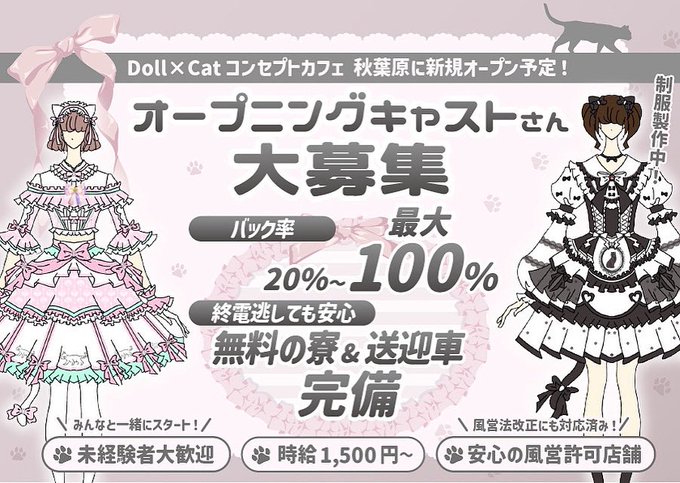 秋葉原・神田 メイドロックカフェ東京みるく@ランジュさんがリポストDollyCats秋葉原コンカフェ@dollycats_akb·9月オープンの人形×猫がコンセプトの ロリータかわいいコンカフェ『DollyCats』🐈 オープンニングキャストさんまだまだ大募集!💖 🐈⬛かわいい店内 🐈⬛未経験大歓迎 🐈⬛オープニングだからみんな同じスタート ᨳご応募はこちらᨴ 応募はこちらから ▶️http://lin.ee/HdgIx7L #キャスト募集 #秋葉原4101,066