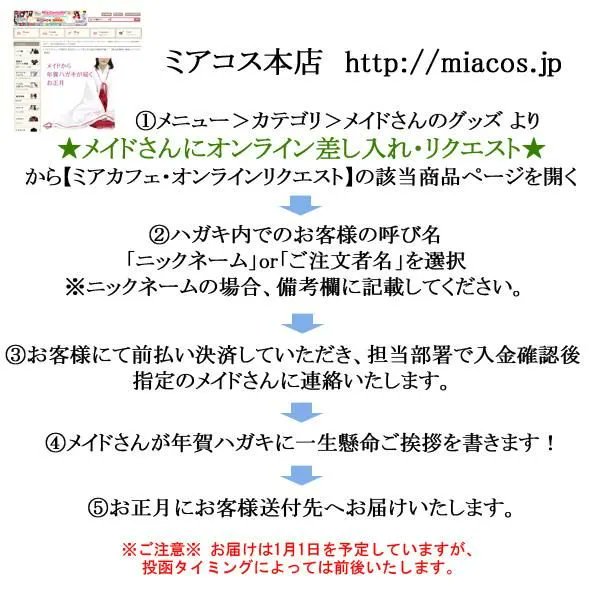 秋葉原・神田 メイドカフェ・ミアカフェ秋葉原店(2004年創業!)【公式】 秋葉原メイドカフェ ミアカフェ秋葉原店 🌸 メイドリフレ 撮影会 ミアリラ&フォト東京店さんがリポストコスプレ通販 ミアコスチューム公式@ミアカフェ 秋葉原 cosplay メイド喫茶 メイドカフェ@miacostume·【ミアカフェ・リクエスト】 年賀はがきの発売が始まっていますね💌ミアコスチュームではミアカフェのメイドさんから手書きの年賀状が届くサービスを取り扱っています! ・<2026年>お正月にメイドさんから紙の年賀状が届く! https://miacos.jp/?pid=18770823745200