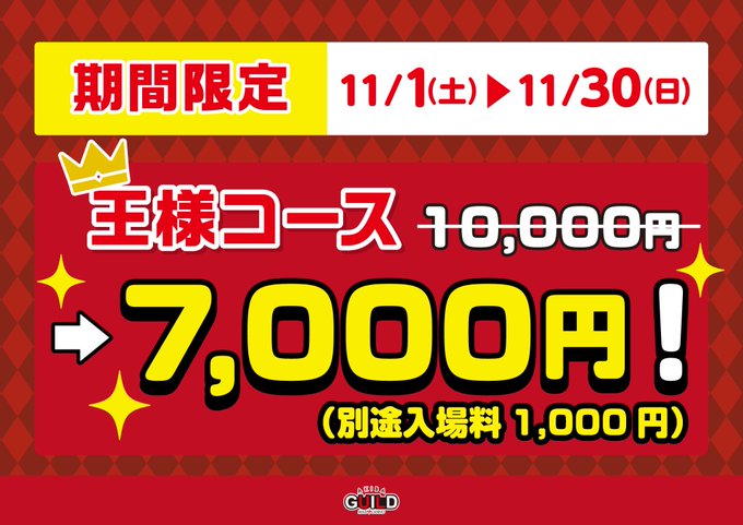 秋葉原・神田 アキバギルドアキバギルド メイドカジノ@AkibaGuild·👑お得に王様になれるチャンス👑 11月1日(土)〜30日(日)開催中♥️ ✨王 様 コ ー ス 7,000円✨ 普段より格段にお得に! 王様になって遊び倒しちゃいましょう👑 ご帰宅お待ちしてます♥️424