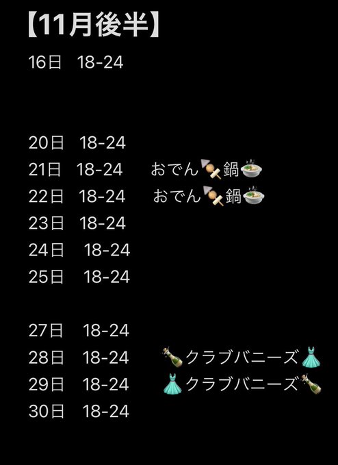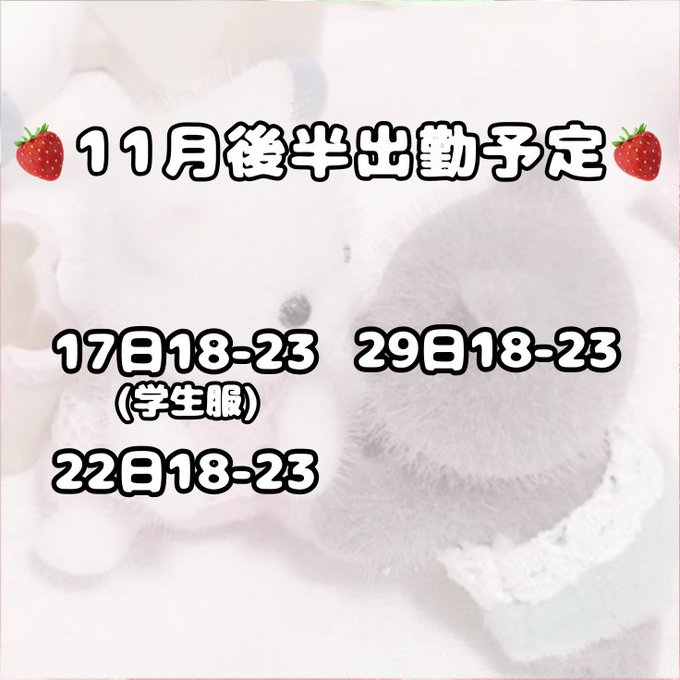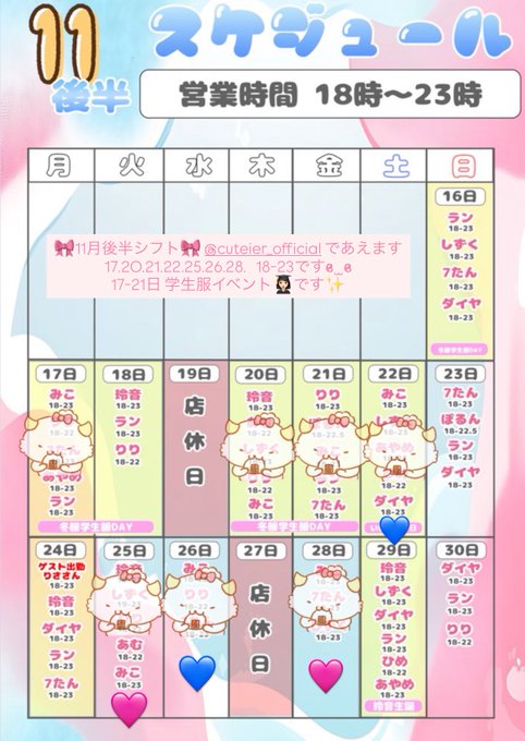 秋葉原・神田 Cuteier固定あやめ@1ym_Hug·♡11月後半の出勤予定になります♡ 29日は玲音さんの誕生祭!!!💖💖 学生服Dayもありますよろしくお願いします(՞ ᴗ ̫ ᴗ՞)114593