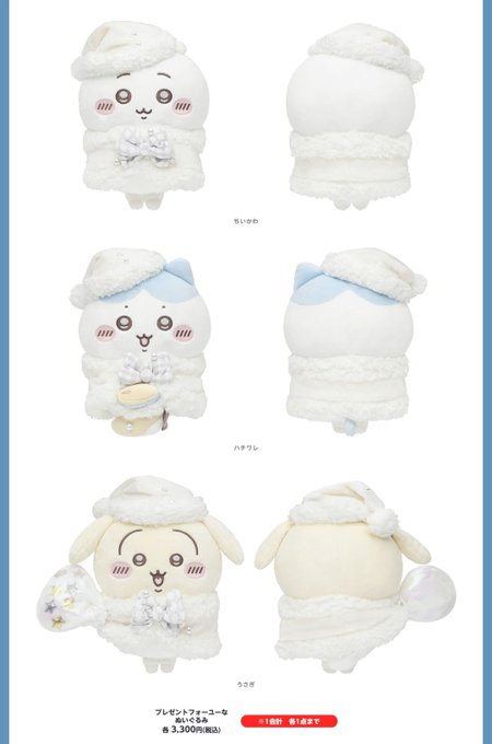 秋葉原・神田 AnDiaのあ@AnDia_noa·7時間とてもほしい😭😭😭引用ちいかわグッズ公式@chiikawa_kouhou·9時間\新商品/ 『ちいかわ プレゼントフォーユーなぬいぐるみ』 (ちいかわ、ハチワレ、うさぎ) 📝11月21日発売 ・ちいかわマーケット(オンラインストア) (https://chiikawamarket.jp) ・ちいかわらんど (原宿店、大阪梅田店、福岡パルコ店、京都四条河原町店、TOKYOさらに表示1138