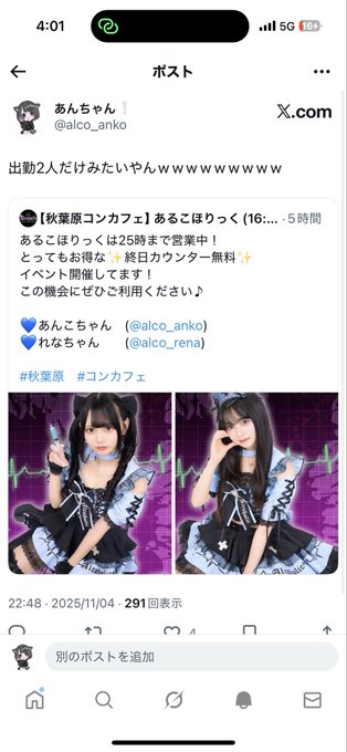 秋葉原・神田 コンカフェ あるこほりっく 秋葉原院ぽかり🦭@alco_pokari·11時間今日も17時からいるよー(՞ ᴗ ̫ ᴗ՞) なんだかうまく寝付けなくてそこそこ寝不足のため今日こそは早く帰っちゃおうかなと思ってますのでもし来ようと思ってる推しさんは早めに来るか事前に連絡してくれたら助かります🫠引用ぽかり🦭@alco_pokari·11月4日今日も17-24時です!!! 推しさん予定くださいおねがいします‼️‼️4290
