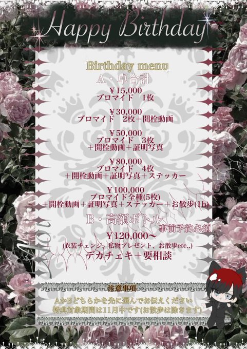 秋葉原・神田 私立輝羅星学院プリンス部固定葵@aoi____0001·11月登校日🦇 【前半】 1,2,3 5,7,8,9,11,12,14,15 【後半】 16,18,19,21,22,23,25,26,28,29,30 全日17時からいます🦇 ※相談で16時からも可◎! 🦇11月お誕生日メニューあります🦇14279