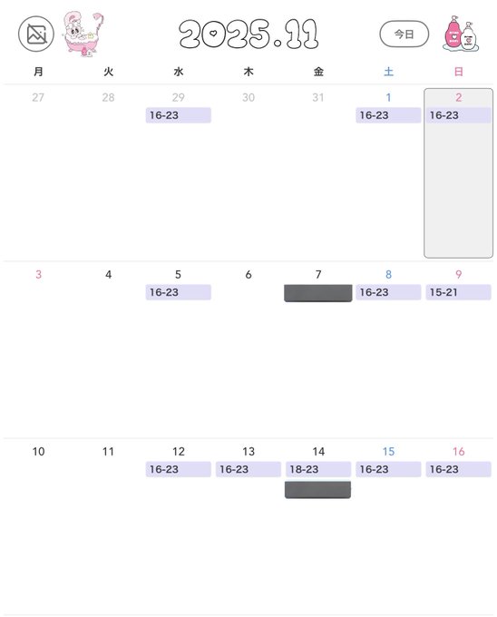 秋葉原・神田 Bunny's Guild バニーズギルド固定12月20日周年イベ🍒ちえりちゃん🐰@cherry0305_BG·11月前半 1日 21-5 4日 18-24 7日 21-5 8日 21-5 11日 18-24 14日 21-5 15日 21-5245856