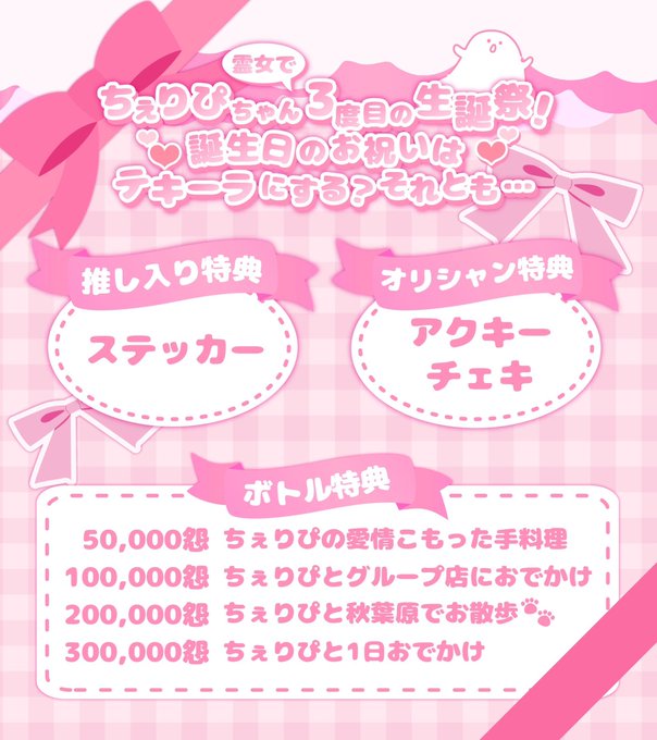 秋葉原・神田 マーメイド 秋葉原コンカフェあるふぁさんがリポスト♡すごくのめるちぇりぴさん🍒♡@reijo_cheri·【2025.11月月間イベント】 ちぇりぴちゃん (霊女で) 3度目の生誕祭! ♡誕生日のお祝いはテキーラにする?それとも…♡ 11月浮遊日は #ちぇりぴとのめる日 推し入りステッカー、オリシャン等諸々かわいく作ってもらったので貴方に沢山お祝いしてほしいです🎀1525653