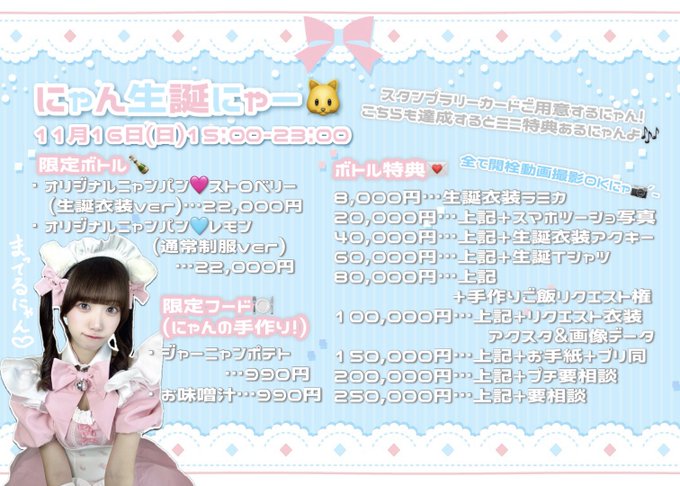 秋葉原・神田 みゃおみゃお 秋葉原 コンカフェ & メイドカフェよる☁️15.16.20@yoru_myao·11月中旬お給仕予定❤︎ 15日16-24時🎂💛 16日18-23時 20日19-23時 大好きな後輩子猫ちゃんの生誕いっしょにお祝いできるのうれしい!!中旬も待ってます♪✨✨113264
