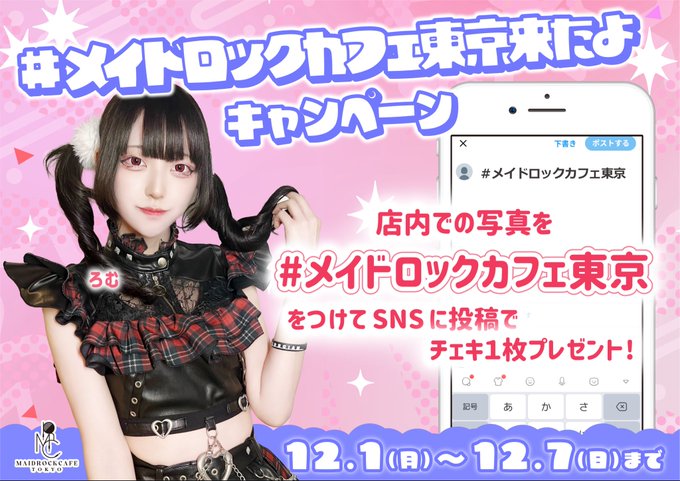 秋葉原・神田 メイドロックカフェ東京ろむ@MAIDROCKCAFE東京@rom2_mrc·8時間おれです!今日から1週間です♡引用MRC TOKYO@mrcafe_akiba·11時間📡緊急発信📡 12/1(月)-12/7(日) #メイドロックカフェ東京 をつけて SNSに投稿で チェキ1枚プレゼント🎁✨ 推しメイドちゃんとの思い出を形に残そう⚡️ #秋葉原 #コンカフェ26293