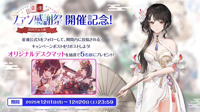 秋葉原・神田 AnDiaはるきP໒꒱AnDiaさんがリポスト正方形のプロフィール画像【公式】雀魂-じゃんたま-@MahjongSoul_JP·【#雀魂 ファン感謝祭2025冬 in 大阪】 #雀魂ファン感謝祭in大阪 開催記念! ▼特設サイト https://mahjongsoul.com/fanfestival2025Osaka/… 雀魂公式Xをフォローして、当ポストをリポストしよう! 『雀魂オリジナルデスクマット』を抽選で5名様にプレゼント! 期日:2025年12月1日(月)~12月20日(土)23:59162,1781,0928.9万
