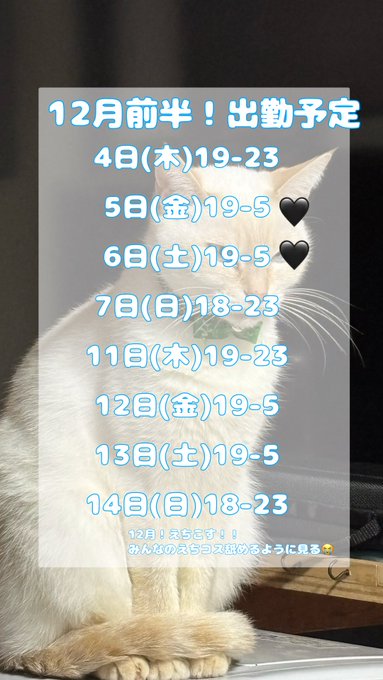 秋葉原・神田 コンカフェ あるこほりっく 秋葉原院ちい にゃ🐼まよらー@alco_chii·7時間♡12月前半♡ 3日(水)18-25 6日(土)18-25 9日(火)18-23:30 12日(金)18-23:30 家庭の用事重なりまくりで12月後半も含めてかなり出勤少ないかもでごめんなさい😭後半あと1日くらいシフト増やしたいからリクエストバンバンじゃんじゃんまってます︎︎👍🏻︎︎⭐️引用ちい にゃ🐼まよらー@alco_chii·11月16日いちばんのわたしをみて♡6530