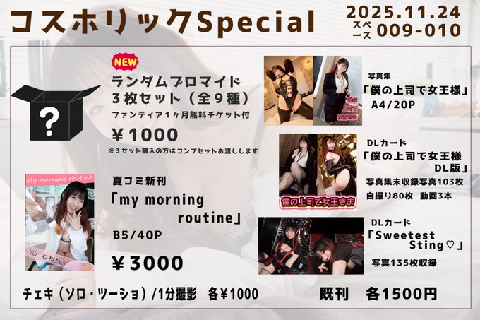 秋葉原・神田 Milk Tears -みるてぃあ-ねねね🍜🐈@neneamane·11月19日お品書きはコチラ! ブロマイドセット、ブロマイドというよりファンティアお試しって感じなのでブロマイド自体は実質3枚で100円とかなので超お得です…引用ねねね🍜🐈@neneamane·11月19日返信先: @neneamaneさん🐾コスホリ 2025年11月24日(月・祝) 14:00~19:00 さいたまスーパーアリーナ スペース09-10 望月学園(うかるちゃんと一緒です!) お品書きは後程載せます~!! 入場パンフは事前ゲット推奨です😌9413,880